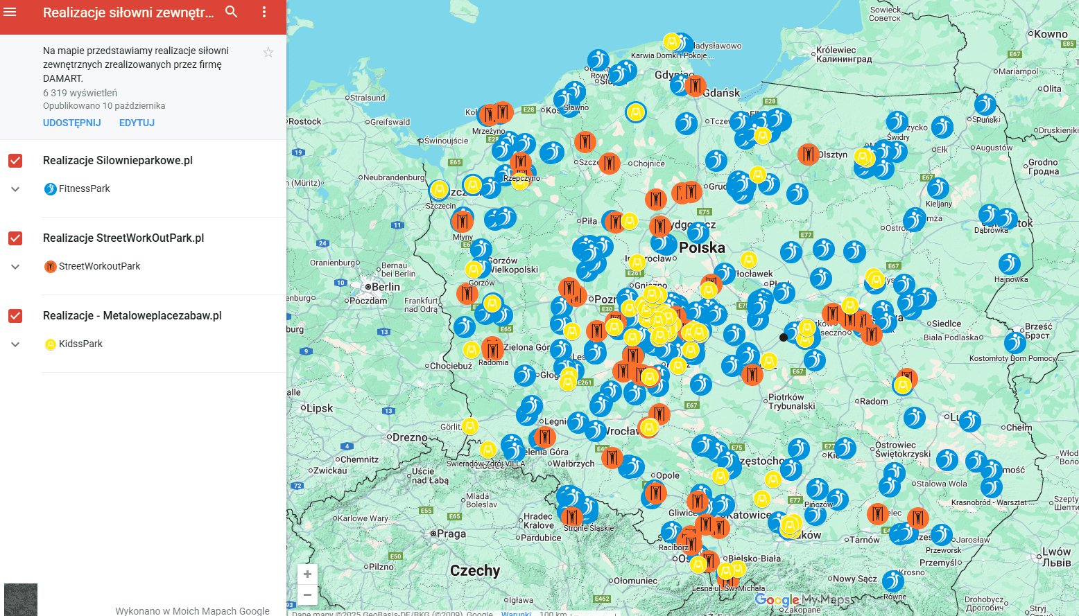 Mapa realizacji pokazuje skalę i zasięg naszej działalności. Zaznaczamy na niej miejsca, w których powstały siłownie zewnętrzne, place zabaw, street workouty oraz elementy małej architektury zaprojektowane i wykonane przez Damart Group.
