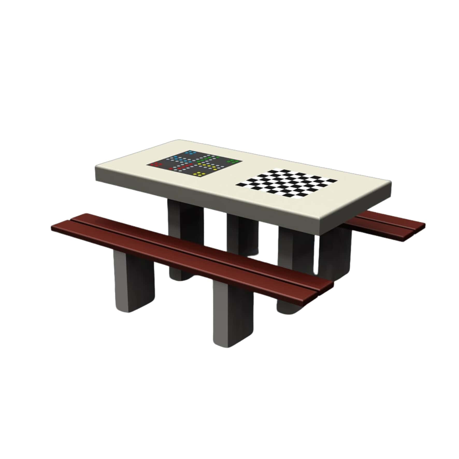 Podwójny stół betonowy do gry w szachy i chińczyka służy do użytku zewnętrznego. Zapewnia możliwość spędzania czasu na świeżym powietrzu oraz rekreacji. Solidna budowa sprawia, że jest odporny na czynniki atmosferyczne i wandalizm. Zapewnia bezpieczną rozrywkę umysłową w komfortowych warunkach. Podwójny stół do gry w chińczyka i szachy posiada atest.