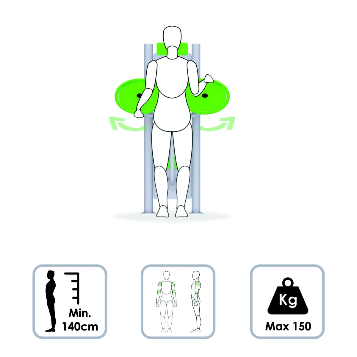 Małe koła montowane na pylonie są rozbudowaną wersją przyrządu gimnastycznego z jednym kołem. Popularną maszynę do ćwiczeń spotkać można w parkach, na terenach rekreacyjnych, plażach i boiskach szkolnych. Wzmacnia mięśnie obręczy barkowej, mięśnie kończyn górnych oraz pleców. Regularne ćwiczenia zwiększają koordynację ruchową oraz minimalizują zastój nadgarstków, łokci oraz stawów ramieniowych. Urządzenie MAŁE KOŁA jest doskonałe podczas codziennych ćwiczeń zarówno dla osób młodych jak i w starszym wieku.