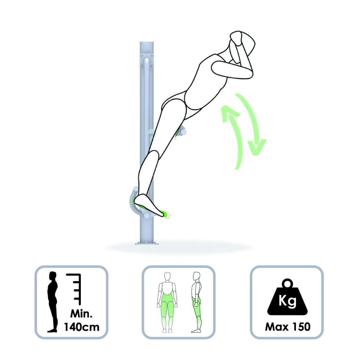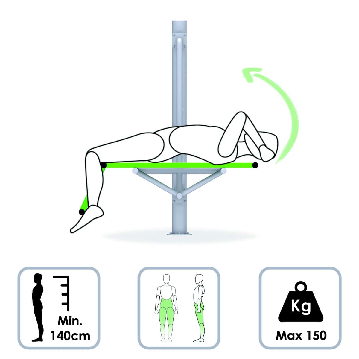 Przyrząd gimnastyczny ławeczka i prostownik pleców montowany na słupie posiada atest bezpieczeństwa. Przeznaczony jest do zewnętrznych siłowni na placach i w parkach. Ćwiczenia nie wymagają nadzoru trenera. Urządzenie używane zgodnie z przeznaczeniem nie wymaga serwisu.