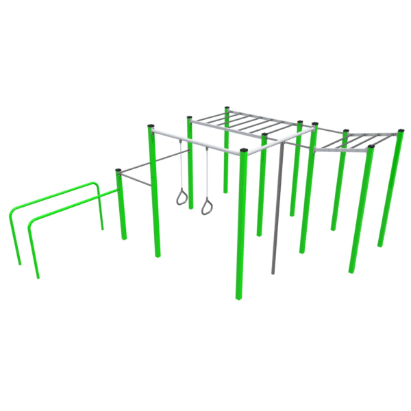Zestaw SWP-47 do street workoutu i kalisteniki zajmuje średnią ilość miejsca. Mimo to posiada na wyposażeniu wiele urządzeń gimnastycznych. Jest idealnie przygotowany do treningów z masą ciała. To za sprawą starannie dobranych urządzeń. Został zaprojektowany dla osób o różnym stopniu doświadczenia i zaawansowania. Nisko zawieszone drążki umożliwiają wiele rodzajów ćwiczeń. Także i akrobatyki freestylowej w street workoucie. Prosta i skośna drabinka pozioma jest odpowiednia do treningów siłowych. Umożliwia proste i skomplikowane ćwiczenia. Podobnie jak równoległe poręcze proste montowane do słupa. Można dzięki nim wykonywać treningi o różnym stopniu trudności. Większe wymagania mają koła gimnastyczne. Ten przyrząd znany z lekkoatletyki wymaga sporej siły. Podobnie jak wspinaczkowa rura strażaka. Mimo to doskonale nadają się do kształtowania muskulatury ciała. Konsekwentne ćwiczenia z masą ciała prowadzą do rozbudowy klatki piersiowej, pleców i obręczy barkowej. Ćwiczenia na zestawie SWP-47 wzmocnią siłę ramion. Zredukują też ilość tłuszczu z brzucha i okolic pośladków. To świetny zestaw do street workoutu i kalisteniki dla każdego. Idealny na mniejsze place treningowe. Doskonale sprawdza się w rozbudowanych street workout parkach.