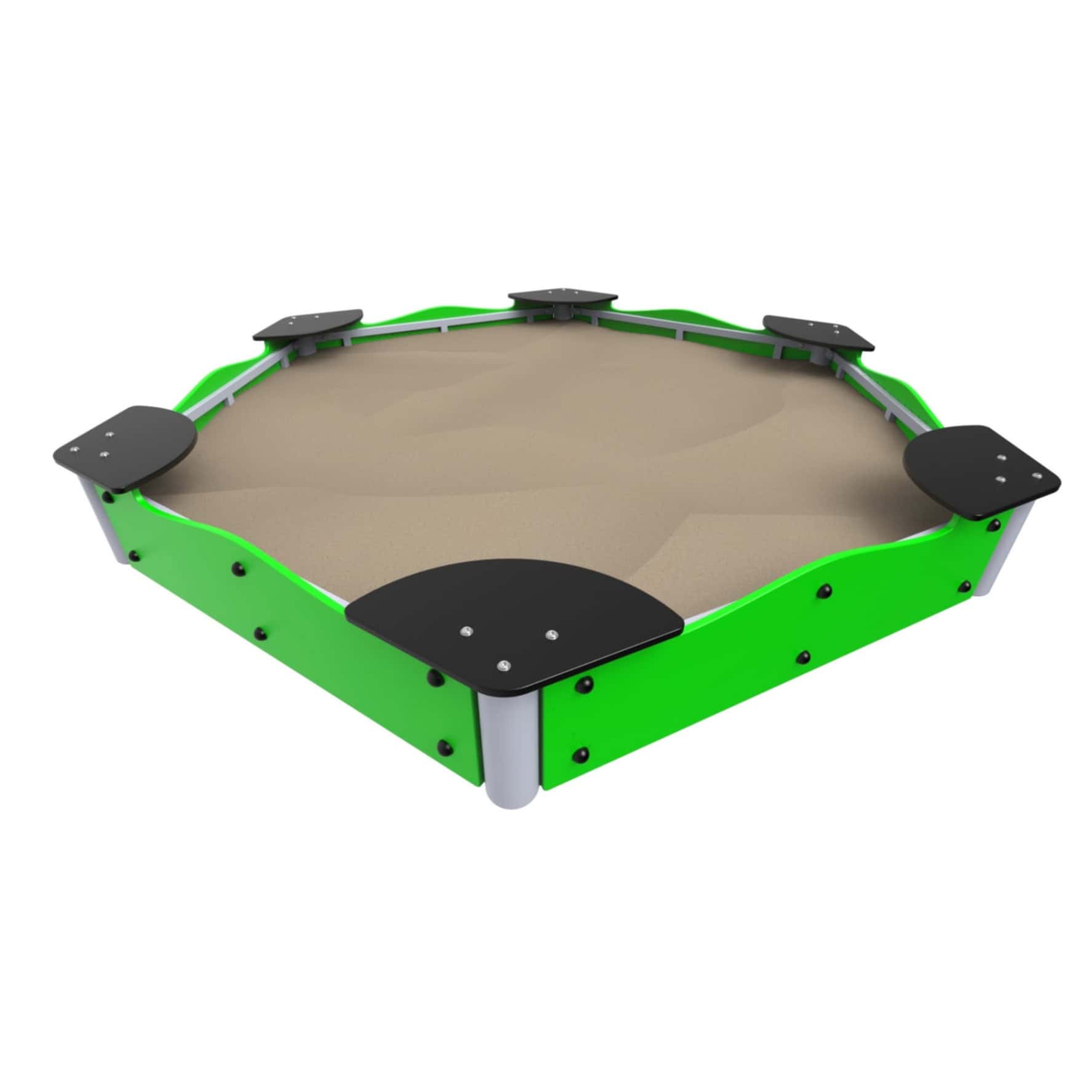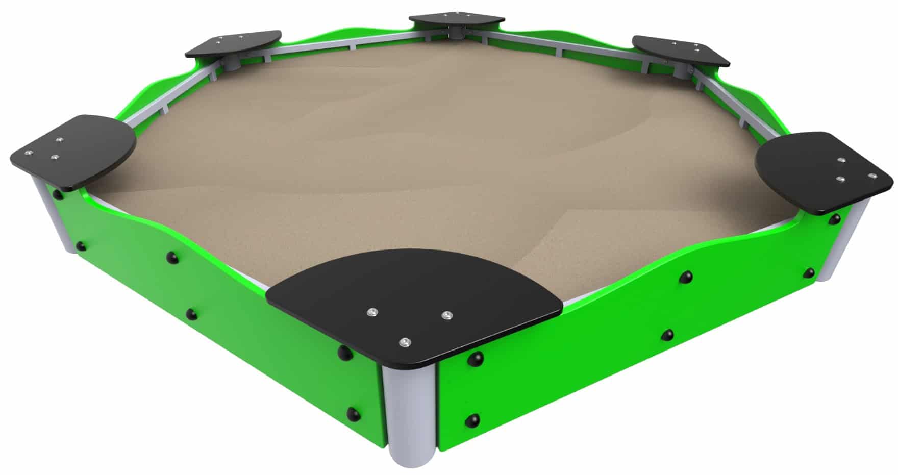 Model ten wyróżnia się ergonomicznym kształtem i praktycznym wykończeniem. Sześć segmentów bocznych wykonanych z kolorowej płyty HDPE stanowi nie tylko zabezpieczenie piasku, ale również wygodne siedziska dla dzieci. Konstrukcja opiera się na stalowych profilach malowanych proszkowo, co gwarantuje odporność na działanie słońca, wilgoci i uszkodzeń mechanicznych.