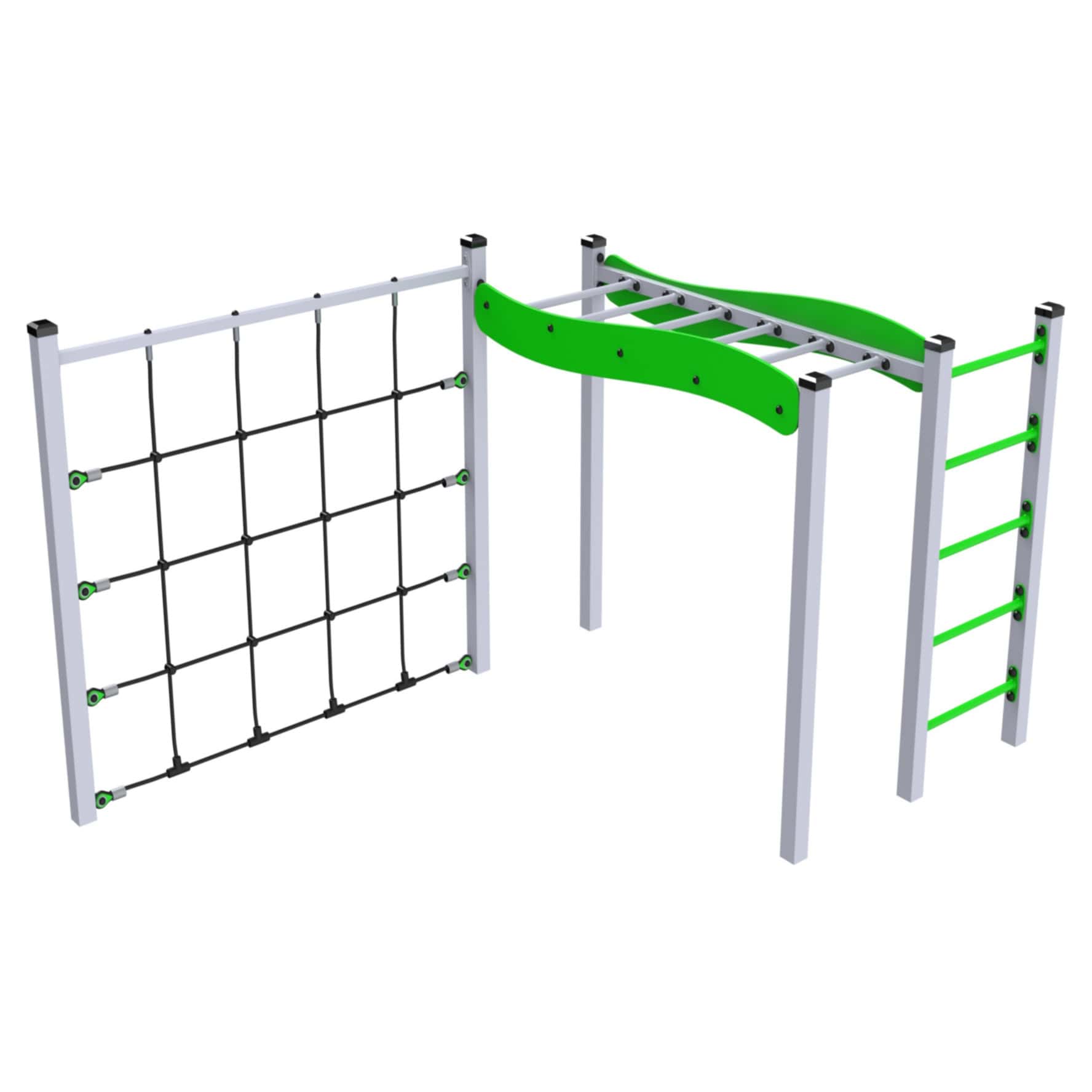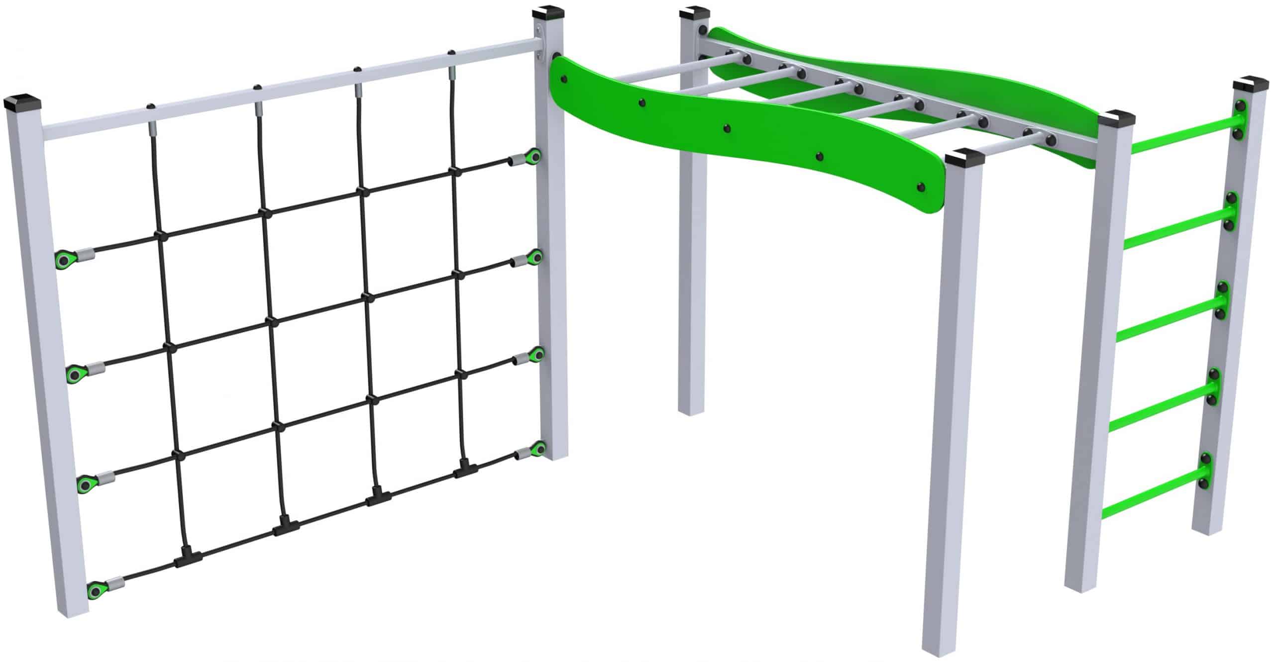 Zestaw składa się z trzech głównych komponentów: drabinki pionowej, przeplotni linowej i poziomej drabinki. Takie połączenie rozwija siłę, wytrzymałość i zwinność, zachęcając dzieci do codziennego ruchu. Niska wysokość konstrukcji w połączeniu z trwałymi materiałami zapewnia bezpieczną zabawę na świeżym powietrzu.