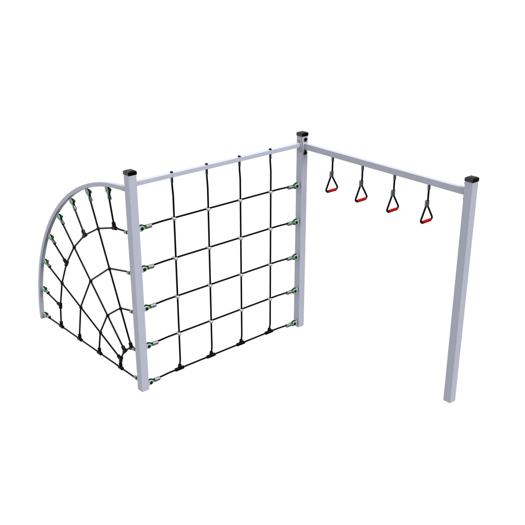 W skład zestawu wchodzą trzy główne elementy: przeplotnia linowa łukowa, przeplotnia linowa prosta oraz belka z uchwytami trójkątnymi linowymi. To idealne rozwiązanie dla dzieci poszukujących wyzwań ruchowych, a jednocześnie świetny sposób na zagospodarowanie przestrzeni sportowo-rekreacyjnej.