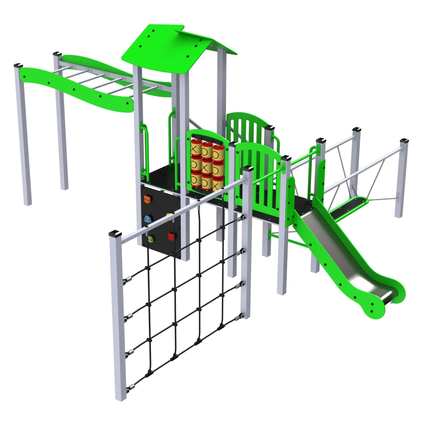 W skład zestawu wchodzą m.in.: klasyczna zjeżdżalnia ze stali nierdzewnej, ściana wspinaczkowa z kamieniami, przeplotnia linowa, schody z poręczą, drabinki oraz interaktywne elementy takie jak gra w „kółko i krzyżyk”. Całość została zaprojektowana z myślą o trwałości, bezpieczeństwie i estetyce, dlatego zestaw doskonale sprawdzi się na szkolnych i osiedlowych placach zabaw, w przestrzeni publicznej oraz przy przedszkolach.