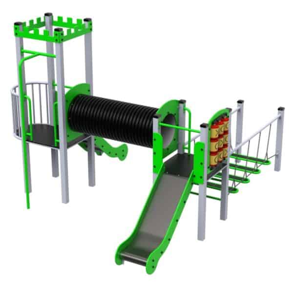 Zestaw KP-105 to wielofunkcyjny plac zabaw z rurą strażaka i przejściem rurowym, idealny dla dzieci w wieku szkolnym, które uwielbiają wspinaczkę, zabawę integracyjną oraz dynamiczną aktywność na świeżym powietrzu.
