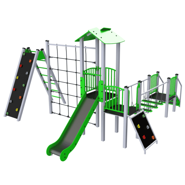 Centralną część zestawu stanowi wysoka wieża bez dachu z licznymi trasami wejściowymi: drabinką pionową, liną, płytą wspinaczkową z kamieniami oraz przeplotnią linową. Uzupełnieniem całości jest zjeżdżalnia, która nagradza wspinaczkowe wysiłki i zapewnia płynne przejście z aktywności dynamicznej do relaksu.
