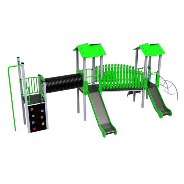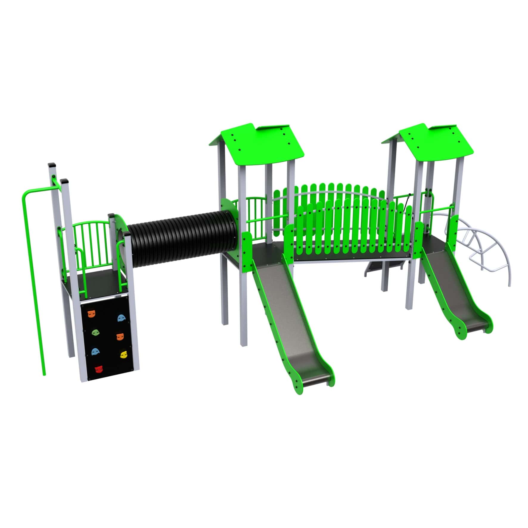 Zestaw składa się z czterech wież – w tym dwóch zadaszonych – oraz licznych pomostów, przejść linowych, przeplotni i paneli edukacyjnych. Dodatkowe atrakcje to drabinka linowa, płyta wspinaczkowa, ślizg oraz przejście rurowe. Taka różnorodność pobudza kreatywność, wspiera rozwój sprawności ruchowej i zachęca do zabawy zespołowej.