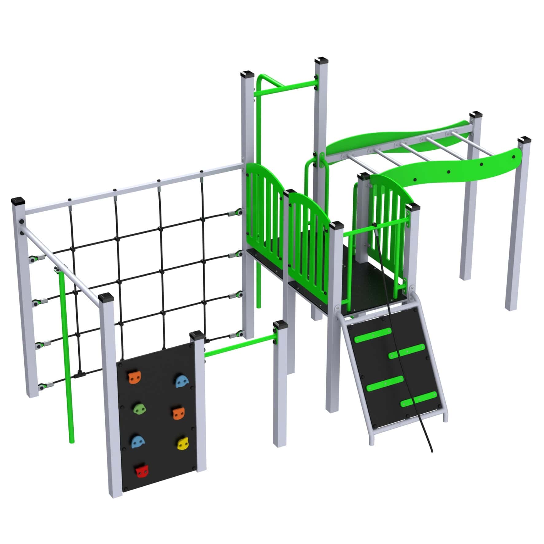 W skład zestawu wchodzą dwie wieże – jedna niska, druga wysoka – a także podest z liną, przeplotnia linowa, drabinka pozioma, rura strażaka między słupami i klasyczna drabinka pionowa. Dzieci mogą wspinać się po pionowej płycie wspinaczkowej, korzystać z poziomego drążka lub zjeżdżać rurą strażaka – zestaw daje wiele scenariuszy ruchowej zabawy.