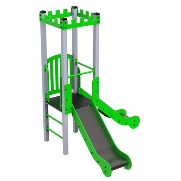 Na zestaw składa się wieża prosta z dachem typu zamek, dwa ślizgi nierdzewne, drabinka pionowa oraz barierka standardowa, które wspólnie tworzą przestrzeń sprzyjającą zabawie, rozwojowi koordynacji ruchowej oraz integracji rówieśniczej.