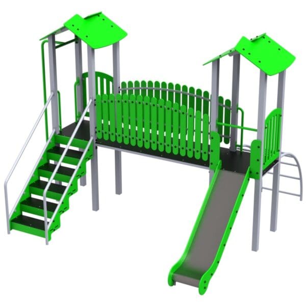 Zestaw wyposażono w dwie wieże proste z dachami dwuspadowymi, ślizg nierdzewny o wysokości 120 cm, drabinkę łukową, pomost prosty z barierką z deseczek, schody z poręczą oraz rurę strażaka. Całość wykonano z materiałów gwarantujących wysoką trwałość i bezpieczeństwo użytkowania.